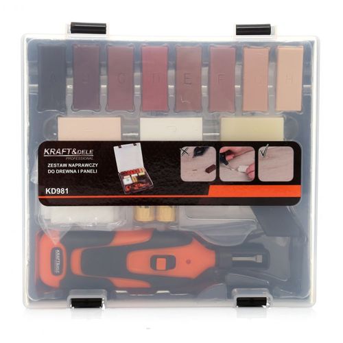 Zestaw naprawczy do drewna o symbolu KD981 do prostej naprawy parkietu oraz powierzchni z laminatu, korka, drewna i wtorzyw sztucznych przez stopienie odpowiedniego wosku.