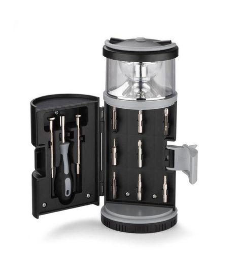 Zestaw narzędzi BARTO to zestaw w kształcie latarni zawierający śrubokręt z 8 bitami, 2 śrubokręty precyzyjne i lampka LED, pełniąca ciekawą funkcję lampki kempingowej.