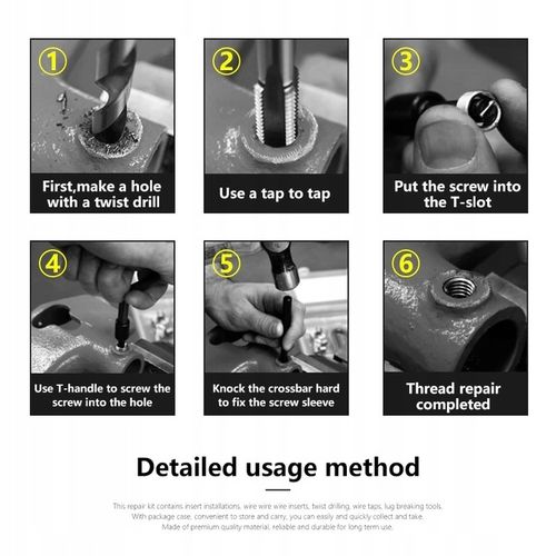 ✔️**Wszechstronna kompatybilność materiałów**: Nadaje się do stali, żeliwa i aluminium, umożliwiając skuteczną naprawę gwintów w silnikach, motoryzacji i narzędziach jak wiertarki.