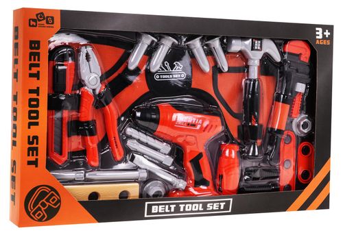 | - regulowany pas na narzędzia, - wkrętarka, - 3 wymienne końcówki do wkrętarki, - nasadka do śrubokręta, - 2 wymienne końcówki do śrubokręta, - kombinerki, - klucz francuski, - nóż, - młotek, - 2 elementy do wkręcania śrubek, - 1 drewienko do wkręcania śrubek, - 2 śruby, - 2 nasadki, - 4 kołki rozporowe. |