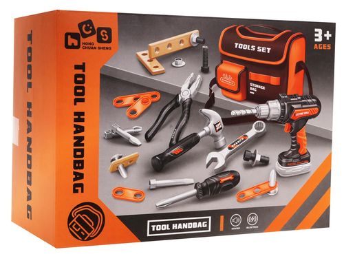 | - torba na narzędzia, - wiertarko-wkrętarka, - wymienne bity do wiertarki: płaski, krzyżakowy, wiertło, - nasadka do śrubokręta, - wymienne końcówki do śrubokręta, - młotek, - klucz płasko-oczkowy, - kombinerki, - 2 mniejsze elementy do wkręcania, - 2 większe elementy do wkręcania, - 3 x drewienko różnej wielkości do wkręcania, - 3 śruby, - 3 nasadki, - 2 kołki rozporowe. |