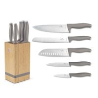 6 elementowy zestaw noży bloku bambusowym firmy BERLINGER HAUS z serii Taupe Collection. Przeznaczone do porcjowania mięsa i ryb, krojenia pieczywa oraz obierania i siekania warzyw. Noże wykonane wysokiej jakości stali nierdzewnej Ferrinox 18/10 o wysokiej zawartości węgla 1.4028/X30Cr13. Istotną cechą tej stali jest fakt, że jest odporna na wszelkiego rodzaju zadrapania, zarysowania, charakteryzuje się zwiększoną odpornością na ścieranie i korozję. Wyposażone w uchwyty pokryte bardzo trwałą cienką warstwą silikonu dla uzyskania pewnego trzymania w każdych warunkach. Noże drewnianym bambusowym bloku. Całość stanowi niebanalny element dekoracyjny w każdej kuchni. Zestaw zawiera wszystkie niezbędne noże do codziennego przygotowywania posiłków.