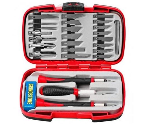 Ułatwia prace stolarskie i precyzyjne, np. wycinanie szablonów lub prace kaletnicze. W zestawie 19 ostrzy noża, 4 wydrążacze. 2 igły, 3 trzonki noża oraz pęseta i osełka. Trzonki noży są powleczone gumą.