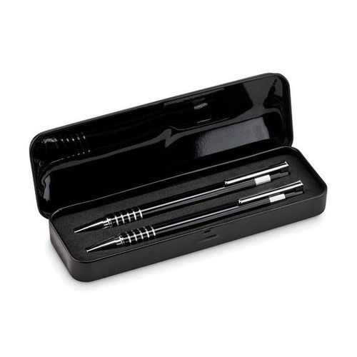 Aluminiowy zestaw do pisania: przyciskany długopis z niebieskim wkładem i mechaniczny ołówek, w dobranym kolorystycznie metalowym pudełku.