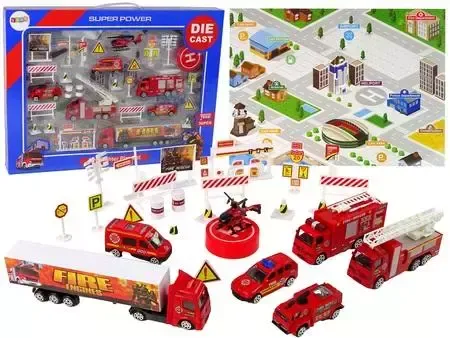 Zestaw Pojazdów Strażackich 30 Elementów Rescue Team Ten zestaw to znakomita propozycja dla wszystkich młodych fanów dzielnych i nieustraszonych strażaków. Zestaw składający się aż z 30 elementów skrywa w sobie zarówno różnorodne pojazdy, jak i elementy konieczne do aranżacji świetnej zabawy. Co ważne, samochody, znaki drogowe i pozostałe elementy wchodzące w skład kompletu inspirowane są realnymi, pełnowymiarowymi przedmiotami, przedstawionymi w skali 1:64. Zabawki wykonane są z połączenia plastiku i metalu, dzięki czemu są bardzo solidne, wytrzymałe, a zarazem bezpieczne w użytkowaniu. Całość zachowana jest w charakterystycznej dla straży pożarnej kolorystyce, składającej się z czerwonej barwy. W zestawie dziecko znajdzie elementy pozwalające na świetną zabawę - maluch będzie mieć do dyspozycji helikopter, naczepę z długą, wysuwaną drabiną, pojazdy Rescue Team , a także figurki strażaka i elementy bezpieczeństwa - pachołki i znaki drogowe oraz stację paliw i lądowisko dla helikopterów. Mnogość elementów wchodzących w skład tego kompletu umożliwia wspólną zabawę i pozwala na to, by dołączyły do niej inne dzieciaki bądź rodzeństwo - z pewnością będzie jeszcze bardziej pasjonująca, a jej scenariusz zaskakujący. Ponadto zawiera w sobie wszystko, co jest wymagane do udanej zabawy. Wymiary opakowania: 48 cm x 36 cm x 6 cm