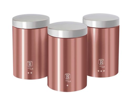 Zestaw 3 pojemników do przechowywania produktów sypkich takich jak kawa, herbata, cukier. Pojemniki z linii iRose firmy Berlinger Haus.Wykonane ze stali lakierowanej na kolor metaliczny.