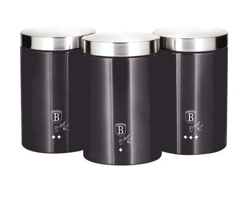 Zestaw 3 pojemników do przechowywania produktów sypkich takich jak kawa, herbata, cukier. Pojemniki z linii CARBON PRO firmy Berlinger Haus.Wykonane ze stali lakierowanej na kolor grafitowy.