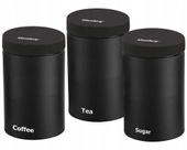 Na pojemnikach napisy Sugar, Coffee, Tea.