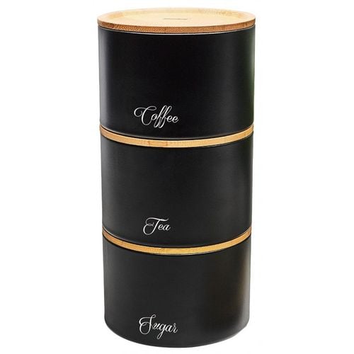 Na pojemnikach napisy Sugar, Coffee, Tea.
