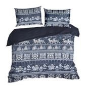Po jednej stronie pościel zdobi subtelny, elegancki nadruk, który wprowadza do wnętrza ciepło i świąteczny nastrój. Druga strona utrzymana jest w głębokim, ciemnoniebieskim odcieniu – idealnym do eleganckich aranżacji. Dwustronna konstrukcja pościeli pozwala w prosty sposób odmienić wystrój sypialni, dopasowując wygląd do nastroju i okazji.