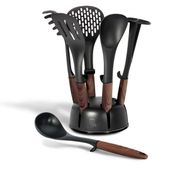7 elementowy zestaw nylonowych przyborów kuchennych firmy BERLINGER HAUS z linii EBONY ROSEWOOD. Przybory polecane szczególnie do naczyń z powłokami ceramicznymi i teflonowymi. Materiał z którego są wykonane nie rysuje powierzchni naczyń. Jest odporny na wysoką temperaturę do 210 stopni C. Posiada szczególne właściwości antybakteryjne.