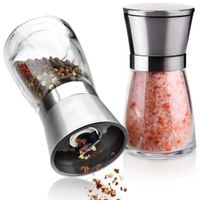 Zestaw dwóch ręcznych młynków do pieprzu i soli. Posiadają regulacje grubości mielenia za pomocą pokrętła. Wyposażone w pokrywkę oraz żarna ceramiczne.