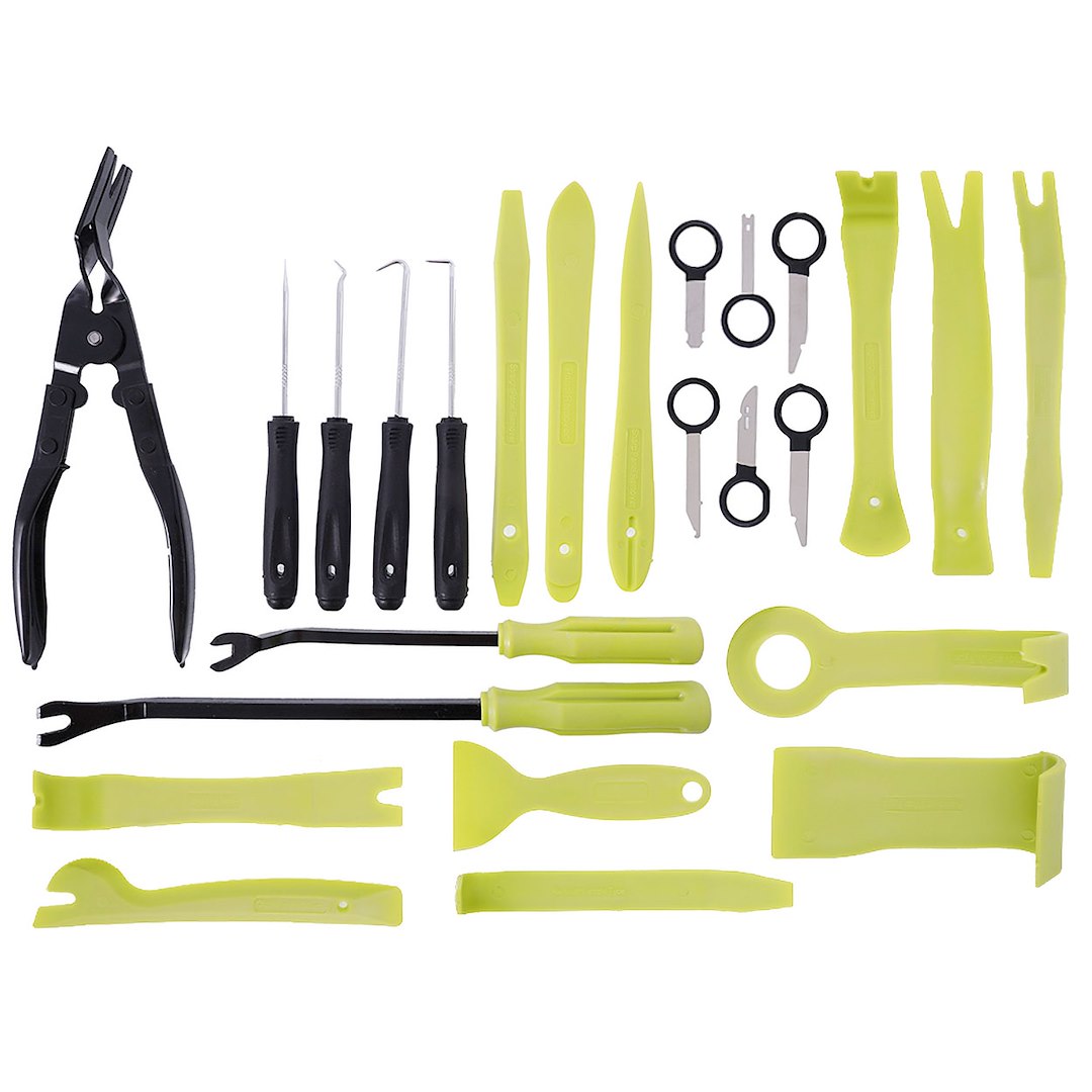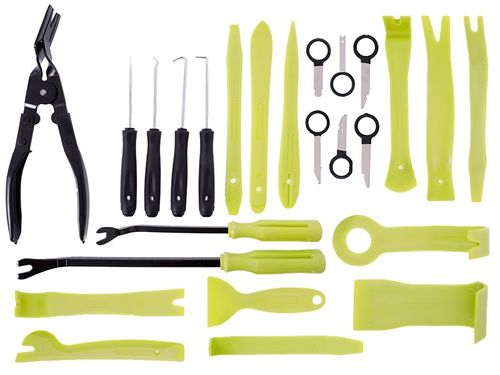 Zestaw ściągaczy do tapicerki - 26 elem.! Oferujemy specjalistyczny zestaw, który okaże się niezbędny w każdym garażu i warsztacie. Idealny do demontażu radia, kostek, listew, spinek oraz tapicerki, jest nieocenionym narzędziem dla każdego entuzjasty motoryzacji oraz profesjonalisty w dziedzinie usług tapicerskich czy blacharskich.