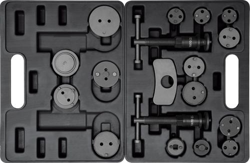 Profesjonalny zestaw przeznaczony do demontażu tłoczków hamulcowych. Przyrząd składa się z dwóch prasek śrubowych - prawoskrętnej i lewoskrętnej oraz zestawu talerzyków umożliwiających wymianę tłoczków w szerokiej gamie samochodów.