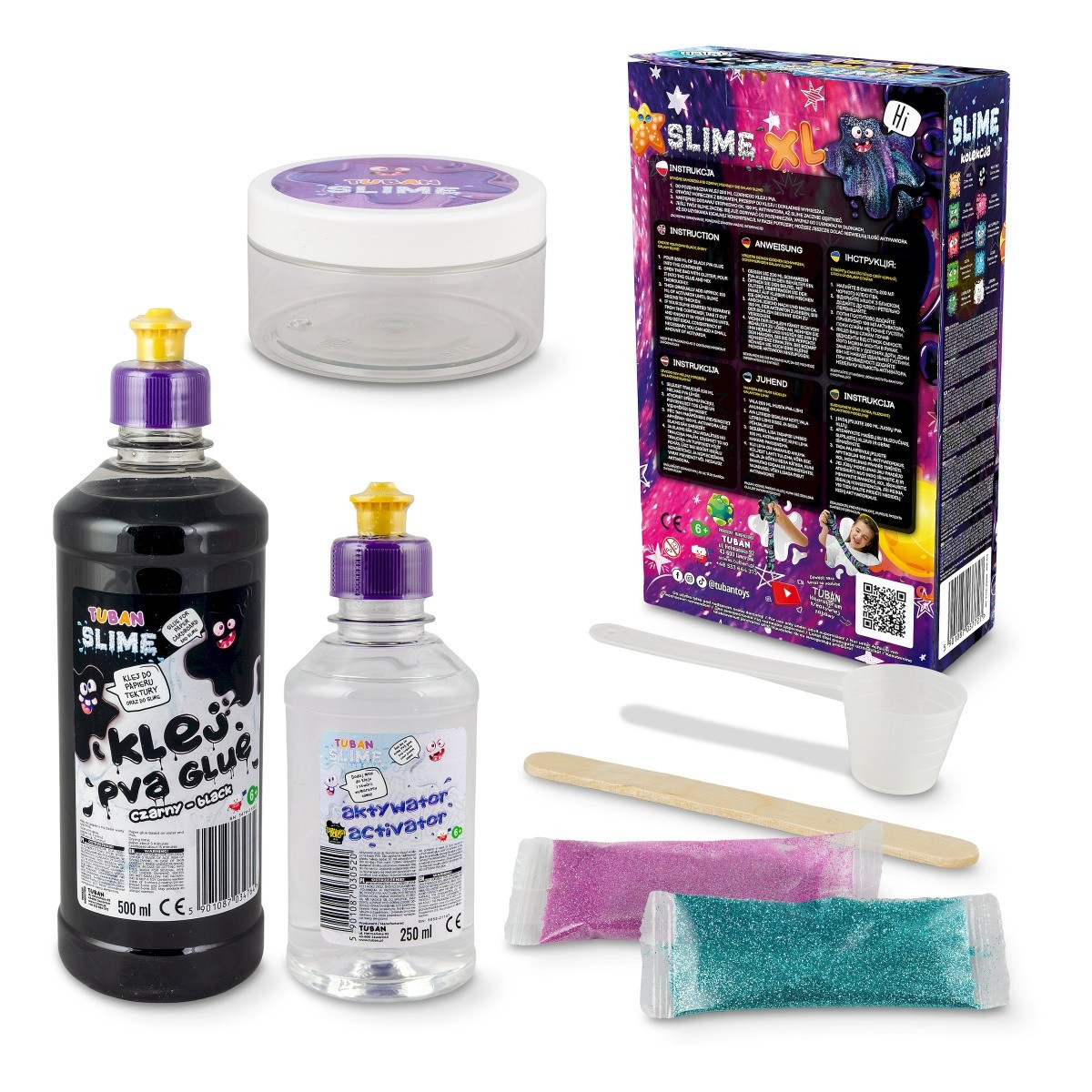 Zestaw DIY GALAXY SLIME zainspirowany został podniebną galaktyką. Zestaw, składający się z czarnego kleju PVA, aktywatora i neonowo brokatowych dodatków, pozwala stworzyć glutka o wyglądzie istnie kosmicznym. Wystarczy połączyć klej z odpowiednią ilością aktywatora, a następnie do całości dodać zawarte w zestawie dodatki. Powstała w ten sposób masa plastyczna zachwyci nawet najbardziej wymagających wielbicieli popularnego SLIME, a jej właściwości w pełni spełnią ich oczekiwania. Zestaw XL wzbogacony został o pojemnik do przechowywania samodzielnie przygotowanego glutka.