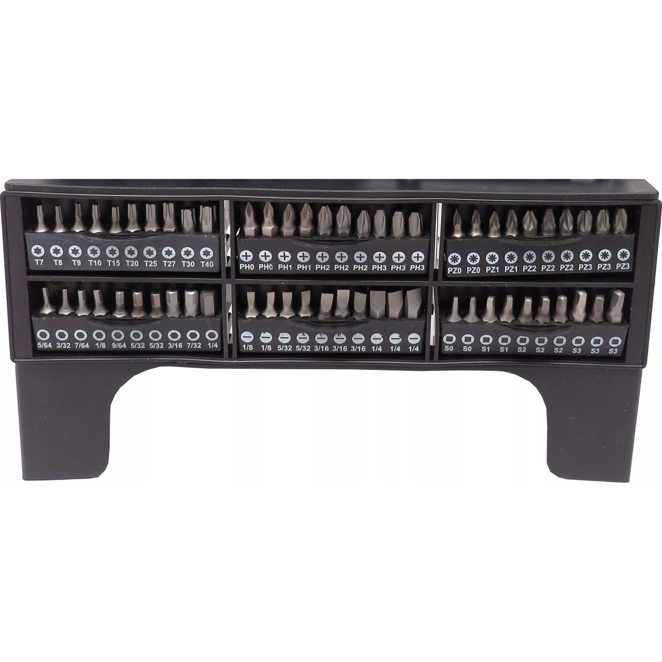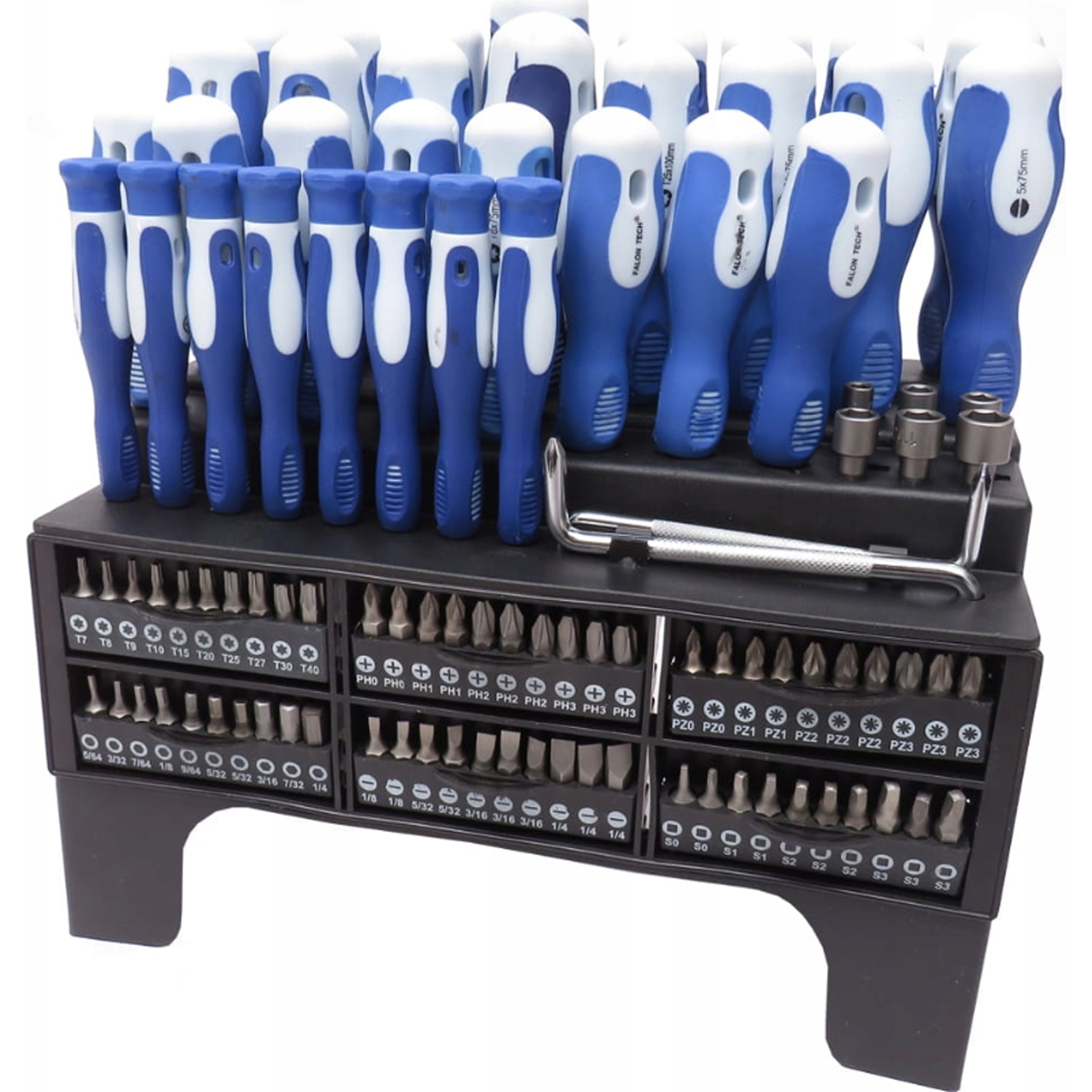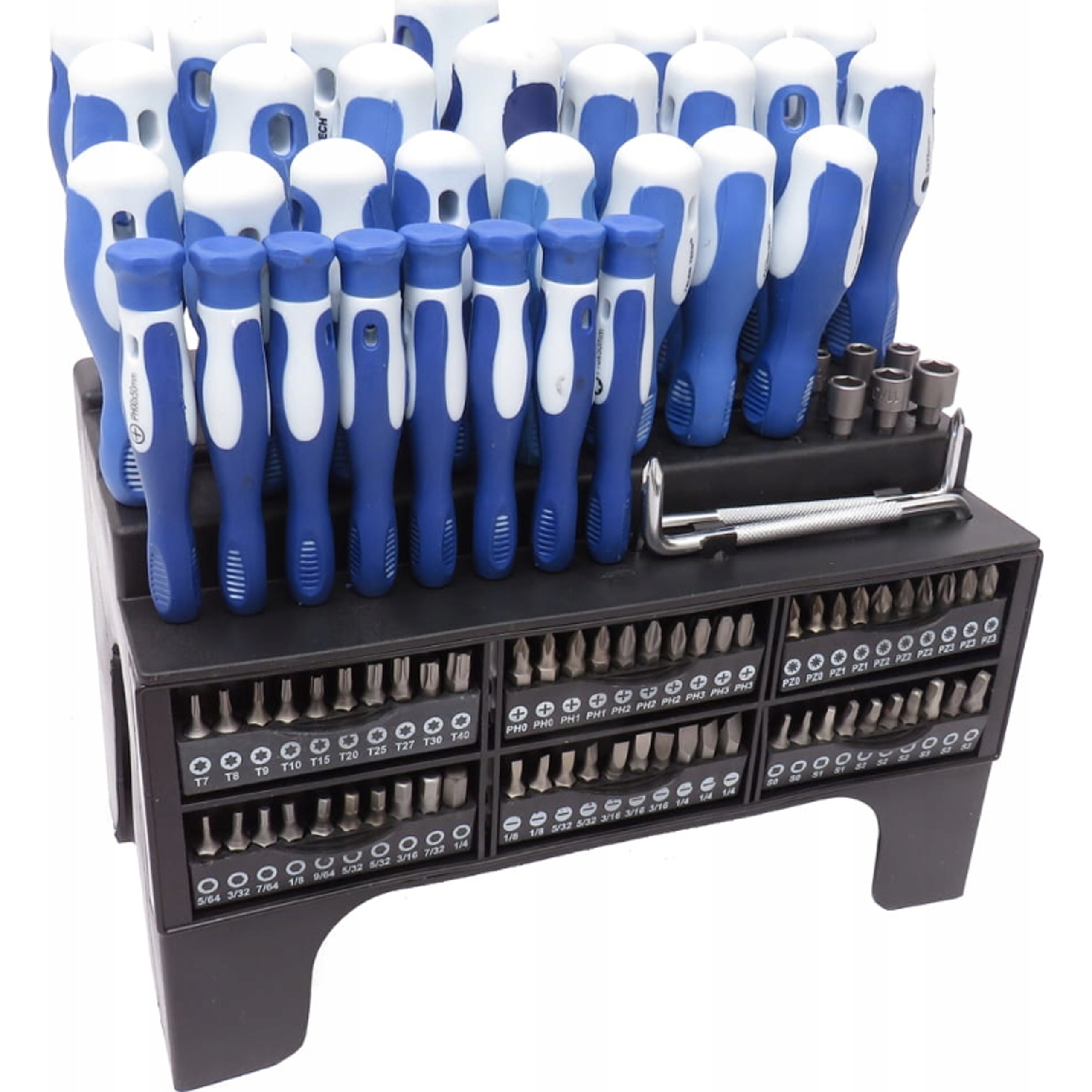 Zestaw 100 magnetycznych wkrętaków płaskich, krzyżowych oraz typu TORX. Został utwardzony oraz wyposażony w magnetyczne końcówki robocze, aby zapewnić wygodne i bezawaryjne użytkowanie.
