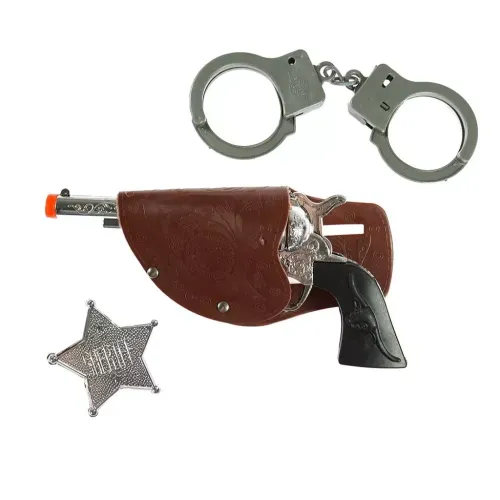 Zestaw akcesoriów szeryfa. W skład zestawu wchodzi pistolet w kaburze, przypinka w kształcie odznaki oraz kajdanki. Kajdanki nie wymagają użycia kluczyka, są bezpieczne podczas zabawy. Zestaw wykonany z tworzywa sztucznego. Doskonały dodatek do stroju policjanta, szeryfa lub jako samodzielne akcesoria na zabawę, bal przebierańców.