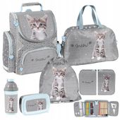 Ciekawa stylistyka z motywem uroczego kotka zachwyci każdego miłośnika zwierząt. Wzór ten nie tylko nadaje zestawowi unikalny i modny wygląd, ale także pozwala dziecku wyrazić swoje zainteresowania. Zestaw składa się z pakownego tornistra, worka na obuwie, piórnika z pełnym wyposażeniem, torby, bidonu i śniadaniówki, oferując wszystko, co niezbędne.
