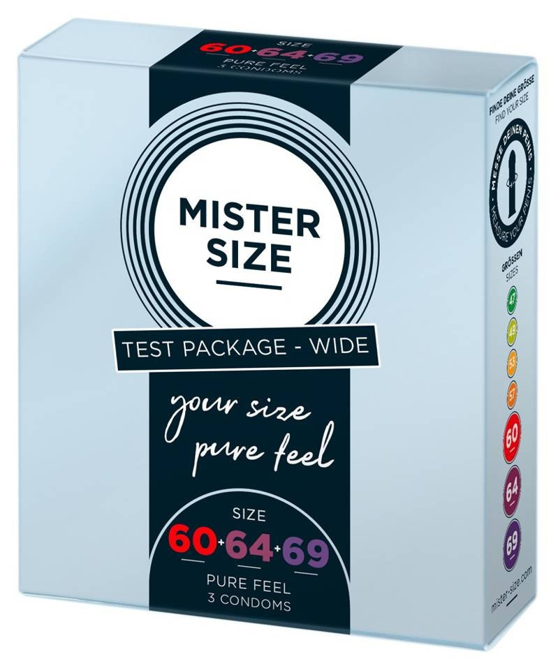 Prezerwatywy Mister Size są dostępne w siedmiu różnych rozmiarach; od 47 mm do 69 mm szerokości nominalnej.