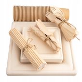 Zestaw zachwyca swoim naturalnym, jasnobrązowym kolorem i strukturą trzciny cukrowej. Talerze są odporne na wilgoć i temperaturę, a kubeczki nadają się do gorących napojów. Sztućce z niebielonego drewna brzozowego mają gładką, polerowaną powierzchnię, zapewniając wygodę użytkowania.