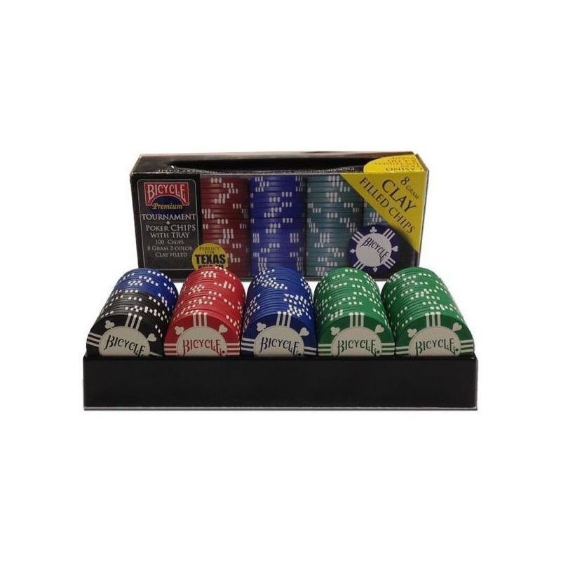 Zestaw żetonów do pokera Amerykańskiej marki Bicycle. Waga pojedynczego żetonu - 8 g. Żetony ułożone na czarnej, plastikowej tacy. Całość zapakowana w efektowny karton. Idealna alternatywa dla domowych rozgrywek jak i profesjonalnych turniejów.