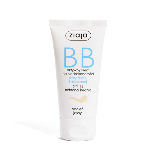 Ziaja BB Aktywny Krem na Niedoskonałości w odcieniu jasnym został stworzony, aby pielęgnować skórę tłustą i mieszaną, jednocześnie wyrównując jej koloryt i maskując niedoskonałości. Kosmetyk skutecznie zmniejsza błyszczenie skóry, normalizuje pracę gruczołów łojowych oraz działa matująco. Dzięki kwasowi hialuronowemu i D-panthenolowi intensywnie nawilża i łagodzi podrażnienia. Zawarta witamina C rozświetla i wspomaga procesy regeneracyjne, a SPF 15 chroni przed szkodliwym działaniem promieni słonecznych i fotostarzeniem.