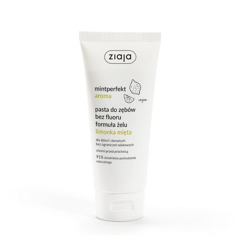💬 Opis produktu Ziaja Mintperfekt Aroma to pasta do zębów w postaci żelu, bez dodatku fluoru – odpowiednia zarówno dla dzieci (od 6. roku życia), jak i dorosłych. Delikatnie oczyszcza zęby, usuwa płytkę nazębną oraz odświeża oddech. Formuła żelowa w połączeniu z aromatem limonki i mięty sprawia, że mycie zębów staje się przyjemne i orzeźwiające.