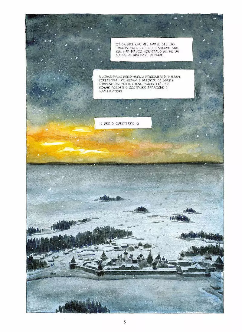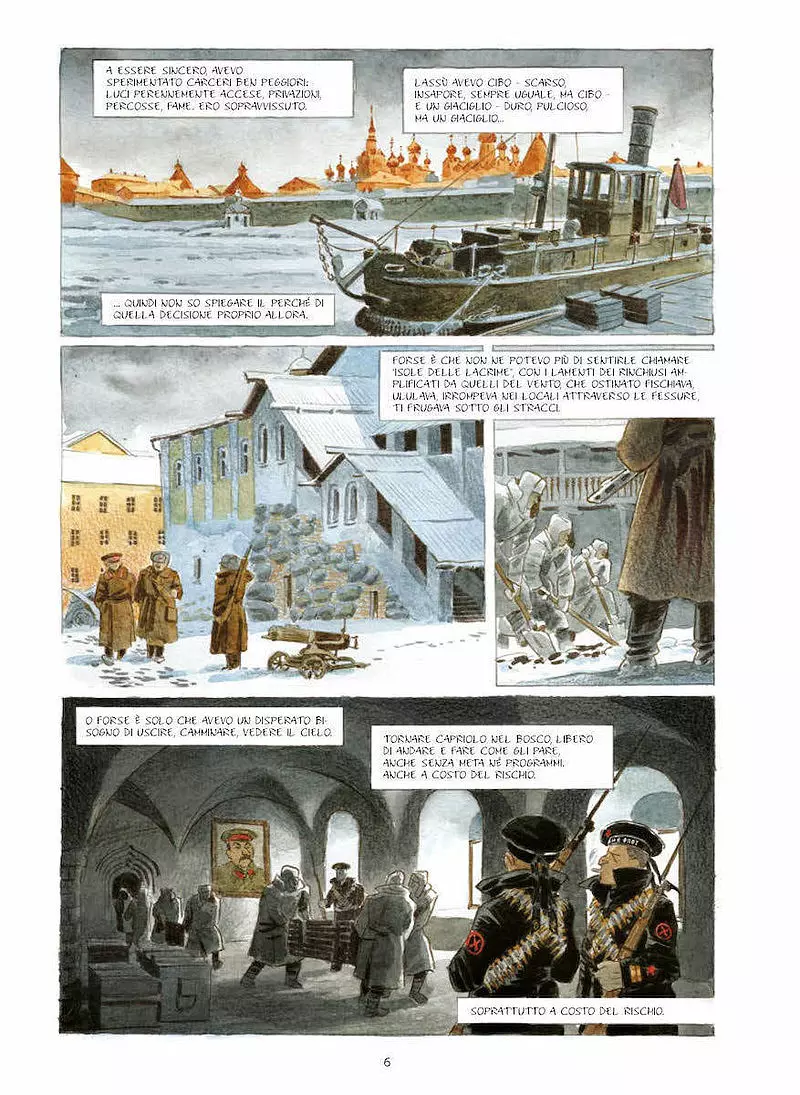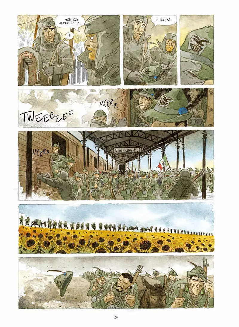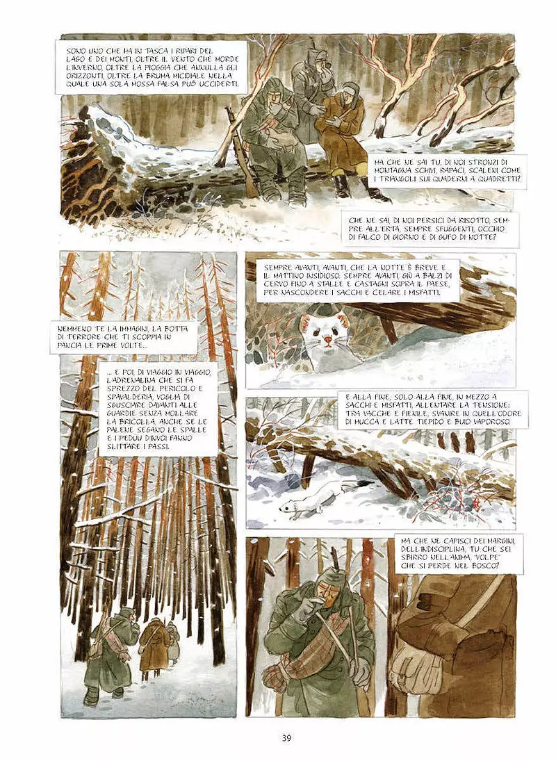 Zima 1943. Front Wschodni. Niemiec i Włoch uciekają z sowieckiego więzienia. Nie znając rosyjskiego ani wrogiego terytorium… porywają radzieckiego sołdata. Tak zaczyna się kapitalnie napisana przygoda trzech mężczyzn nie znających swoich języków, wrogich wobec siebie a jednak połączonych wspólnym celem – uciec jak najdalej od wojny. Im jednak bardziej poznajemy ich życie w cywilu tym bardziej zastanawiają ich postawy przed wojną oraz w jej trakcie. Białe nie zawsze tak jasne, czarne niekoniecznie takie złe… Teresa Radice i Stefano Turcioni wracają w kolejnej brawurowej opowieści. Tym razem zamiast wilków morskich, sztormów, szant i romantycznych uniesień dostajemy pełnokrwisty komiksy wojenny, w którym postawy żołnierskie ważniejsze są od wybuchów i katalogu sprzętu wojskowego. Rysownik „Zakazanego portu” tym razem zamienił ołówek na akwarele i znowu wyczarował cudeńko!