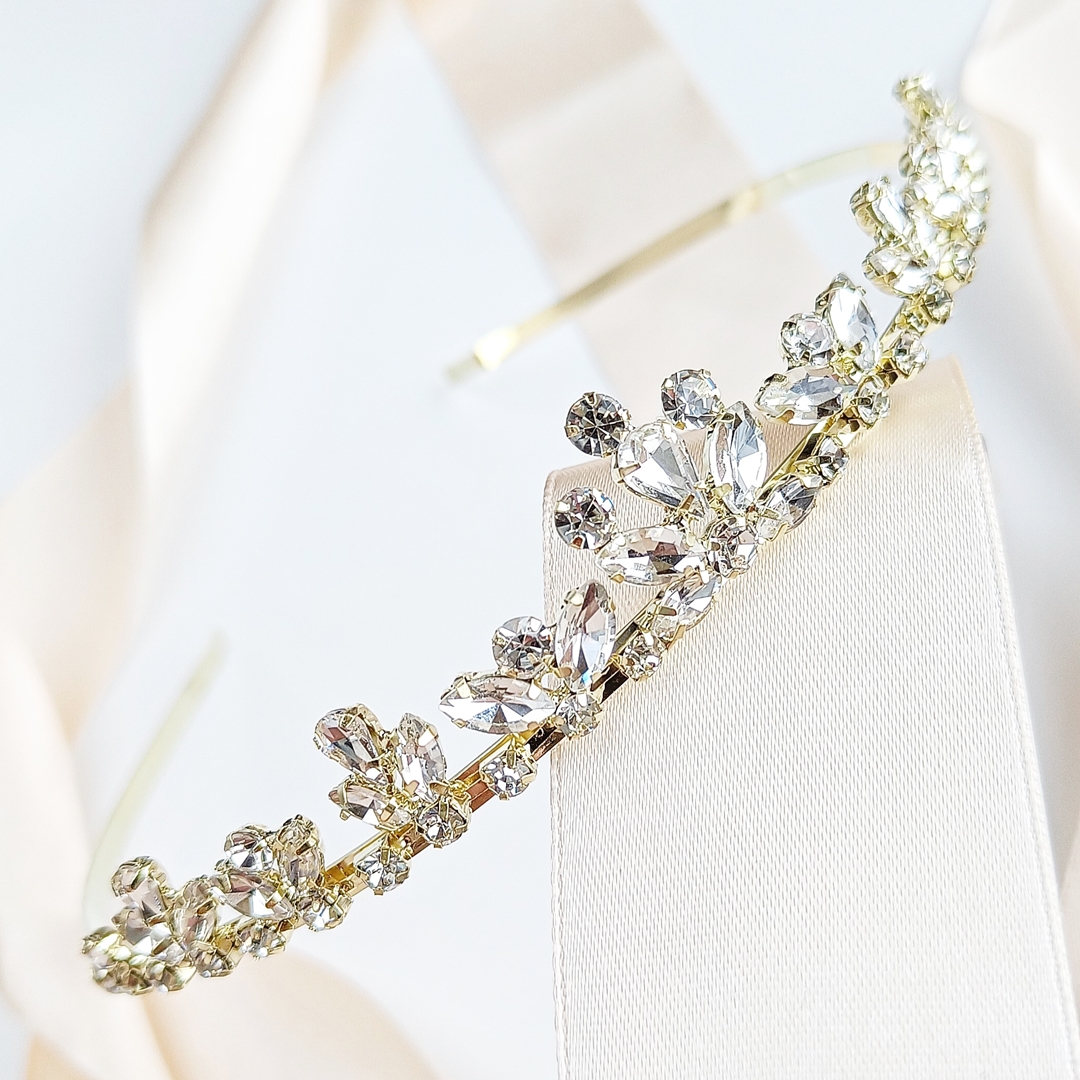 Wielu przyszłych Panien Młodych dąży do perfekcji w swoich stylizacjach. Złota tiara DIADEM jest idealnym dodatkiem, który dopełni modowy wygląd, dodając mu blasku i elegancji. Jej delikatny, błyszczący design wysadzany wysokiej jakości cyrkoniami, sprawia, że staje się ona niezwykle efektownym akcentem we włosach, harmonizując z gorsetowymi sukniami ślubnymi.