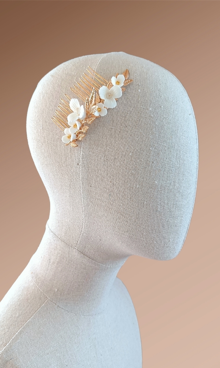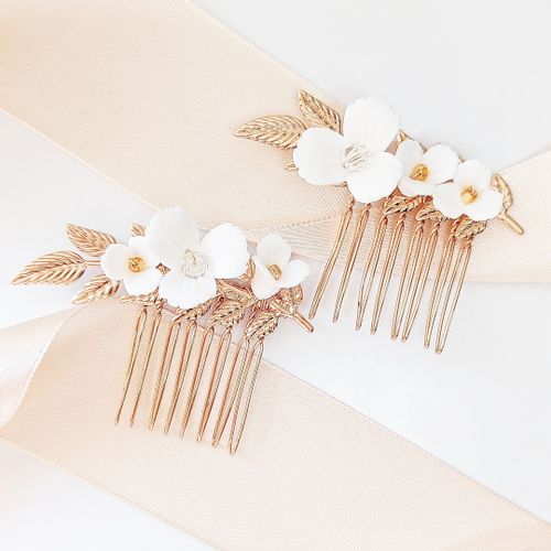 Delikatne złote grzebyki z kwiatami wepniesz z powodzeniem w bok fryzury, nadając charakteru ślubnej stylizacji. Możesz je wpiąć blisko siebie, lub osobno – wszystko w zależności od Twojej wizji.