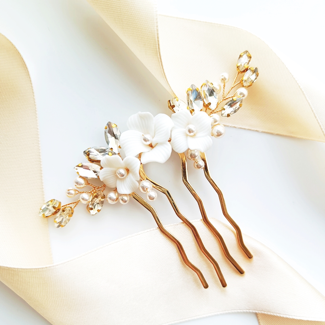 Dobrze by było gdyby elegancką fryzurę ślubną wykończyć poprzez dobranie do niej równie pięknej i lekkiej ozdoby do włosów. Taki właśnie złoty grzebyk ślubny widzisz przed sobą - delikatny ale cudowny efekt który z nim osiągniesz oczaruje wszystkich. Obecność kwiatów w towarzystwie perełek i cyrkonii wygląda lekko i bardzo dostojnie.
