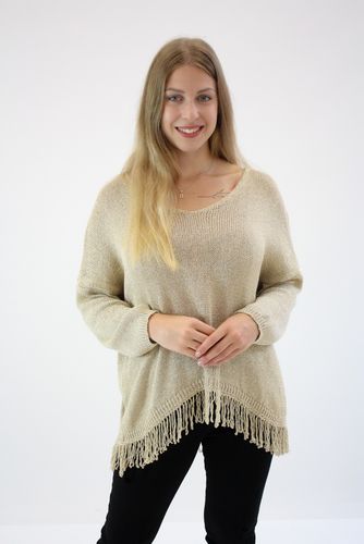 Ten sweter to połączenie złotej elegancji z niekonwencjonalnym krojem, które sprawią, że wyróżnisz się z tłumu. Wykonany ze złotej nitki sweter emanuje niepowtarzalnym urokiem z odrobiną frędzelków.