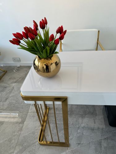 Fenomenalny wazon na kwiaty wykonany z metalu w kolorze złotym. Nowoczesny i niepowtarzalny wygląd sprawia, że kwiaty prezntują się w nim fenomenalnie.