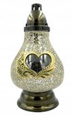 Ten elegancki znicz szklany w formie karafki z witrażowym sercem i efektem lustra zachwyca wyjątkowym wykonaniem z grubego, twardego szkła, które zapewnia niezrównaną odporność na codzienne wyzwania. Zdobiony złotym sercem na mozaikowej powierzchni, odbija światło w sposób, który tworzy subtelną, trwałą aurę zadumy, idealnie oddając hołd bliskim w każdym momencie.