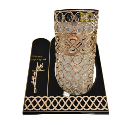 Elegancki znicz solarny o wysokości 25 cm, osadzony na stylowej podstawie z napisem „Wieczny odpoczynek…” i złotym motywem kwiatowym. Dzięki wbudowanemu panelowi solarnemu znicz automatycznie ładuje się w ciągu dnia i świeci po zmroku, nie wymagając wymiany wkładów.