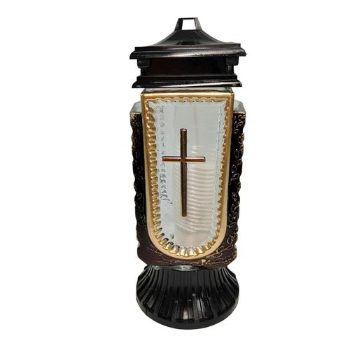 Znicz szklany ze złotym krzyżem i złotymi zdobieniami.
