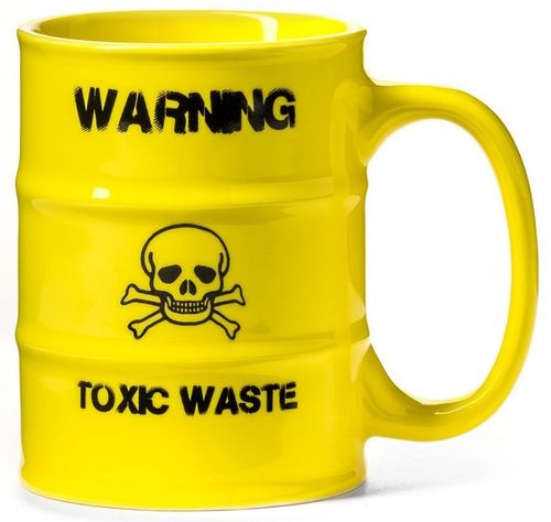 Uwaga TOKSYCZNE ODPADY czyli TOXIC WASTE w normalnych warunkach taka zawartość powinna wywoływać natychmiastową reakcję ucieczki, ale na szczęście jedyne reakcje w kontakcie z naszym kubkiem to uśmiech i satysfakcja :) Kawał kubka w kształcie beczki w jaskrawo żółtym kolorze i z wymownym tekstem WARNING TOXIC WASTE oraz symbolem trupiej czaszki, żeby nikt nie miał wątpliwości, że zawartość jest mocno toksyczna ;)