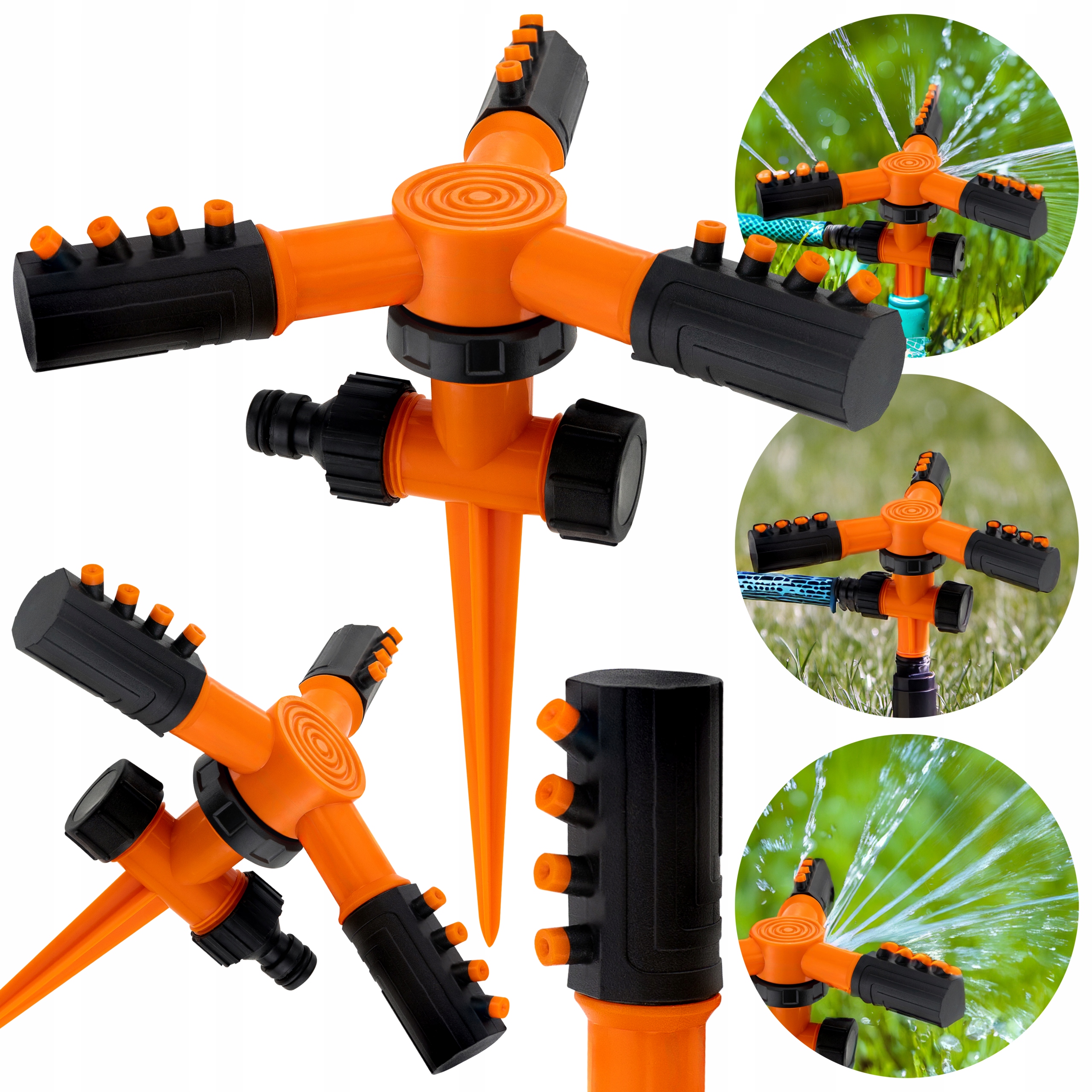 Zraszacz obrotowy trójramienny wykonany został z wysokiej jakości tworzywa sztucznego. Posiada stabilną konstrukcję, którą umieszcza się bezpośrednio w ziemi za pomocą długiego szpikulca. Dodatkowo, za pomocą obracanych końcówek możliwa jest regulacja obszaru działania w górę i na boki. Każde ramię posiada 4 dysze ustawione pod innym kątem, umożliwiające zraszanie na odległość ok. 13 m. Jest bardzo prosty w montażu – wystarczy wbić go w ziemię i podłączyć do węża ze standardową złączką 1/2’’. Z drugiej strony posiada odkręcany zawór 2,5 cm umożliwiający przedłużenie systemu o kolejne zraszacze.