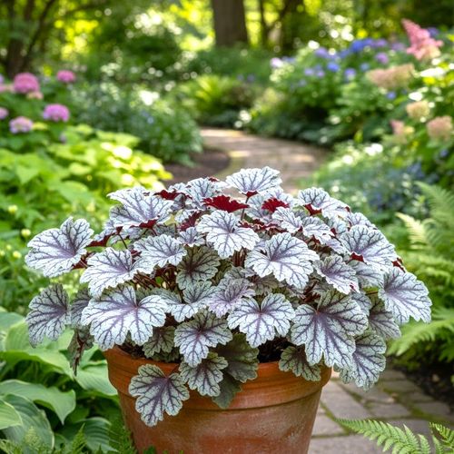 ✅ Spektakularny Kontrast: Jej chłodny, srebrzysty blask fenomenalnie komponuje się z purpurowymi żurawkami (np. 'Fire Alarm') oraz intensywną zielenią paproci.