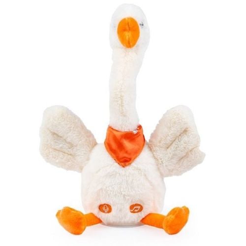 Ta gąska czuje rytm jak mało kto! Naciśnij na przycisk z nutką, znajdujący się na jej brzuchu, aby podziwiać jak tańcuje, trzepocząc skrzydłami i kręcąc podświetloną na kolorowo szyją. Gęś mówi w języku polskim, więc zabawi malucha nie tylko tańcem, ale też wesołymi zwrotami, które wypowiada. Dodatkowo, wyposażona jest także w funkcję nagrywania, a za jej aktywowanie odpowiada drugi przycisk, z ikonką mikrofonu. Po nagraniu dowolnego dźwięku, gęś odtworzy dźwięk, modyfikując jego brzmienie.
