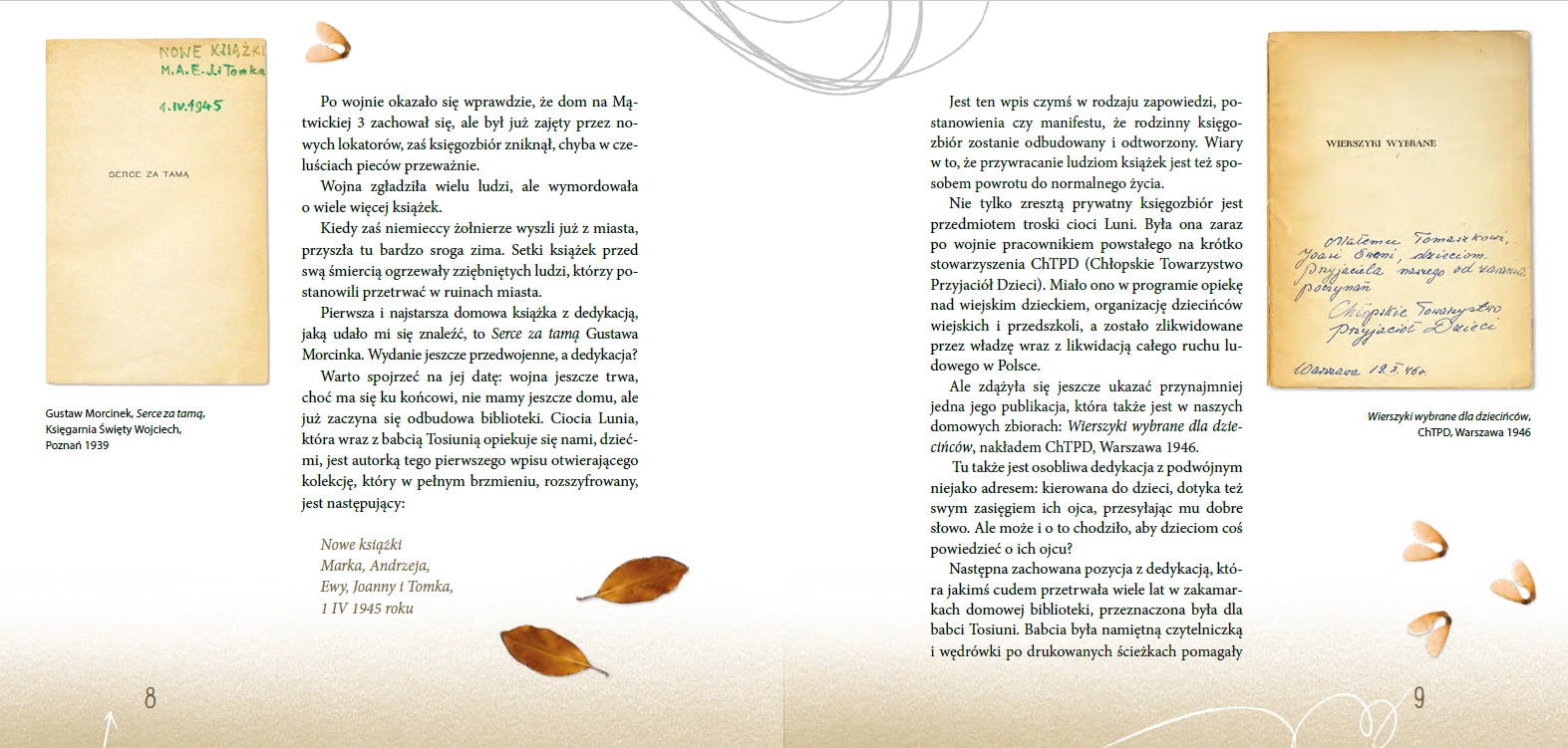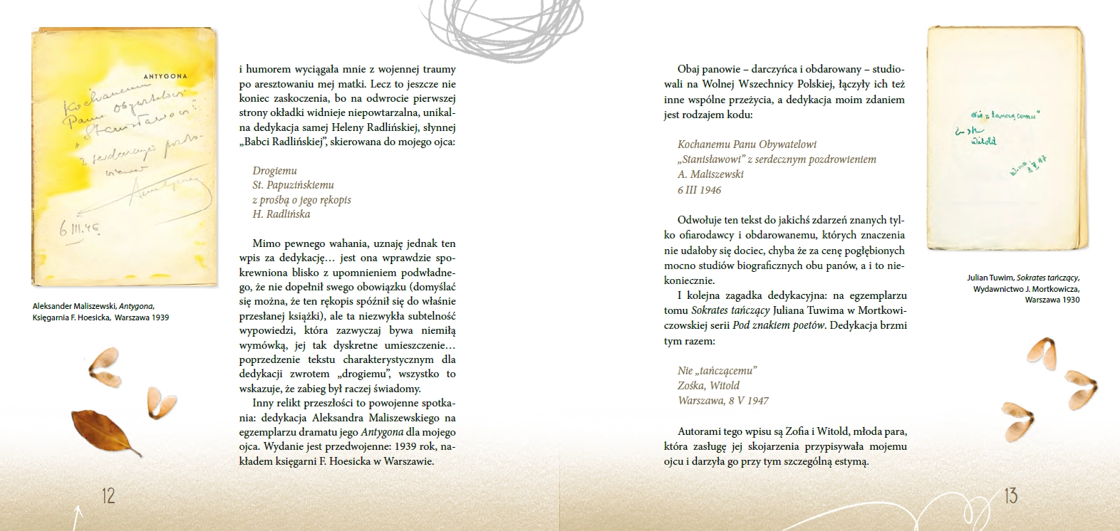 W szkole uczymy się pisania jednolitych kształtów literek, ale z czasem, gdy już odzyskujemy względną swobodę działań, każda ludzka ręka kształtuje je po swojemu i w każdym słowie dochodzi do głosu coś z nas samych – z naszych myśli, uczuć, pragnień, gniewów, radości czy niepokojów. Porównywanie biegu tych ciemnych niteczek na białych kartkach to prawdziwa podróż w nieznane. Nie ma tu wprawdzie białych kruków ani szczególnych bibliofilskich drogocenności. Ale nie one są celem tego tekstu; na pierwszym planie zainteresowań moich znalazły się tym razem drogi i sposoby, w jakich książka przybywała do księgozbioru, oraz towarzyszące temu zdarzeniu okoliczności i emocje.