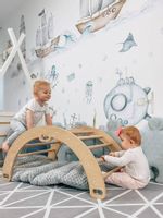 Absolutna łatwość montażu zestawu. Tata poradzi sobie z nim sam! Dostarczane drabinki są w formie złożonej, jako dwie zmontowane półdrabinki gotowe do nałożenia jedna na drugą. Forma konstruktora pozwala dołożyć dodatkowe elementy typu lina, koła gimnastyczne czy huśtawka. Osoby, które nie mogą się zdecydować gdzie taki zestaw zamontować – zawsze mogą wybrać wersję montowaną rozporowo między sufitem i podłogą, co nie wymaga wiercenia otworów w ścianie i pozwoli w przyszłości bezproblemowo przenieść drabinkę na nowe miejsce. Wersja rozporowa także dopasowuje się do wysokości mieszkania. Najmniejszy zestaw zajmuje zaledwie około 0,6 m2. Nasz zestaw Kometa-1 z powodzeniem został zamontowany w pokoju o powierzchni 10,5 m2.