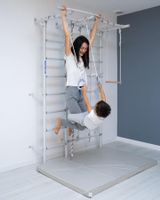 Absolutna łatwość montażu zestawu. Tata poradzi sobie z nim sam! Dostarczane drabinki są w formie złożonej, jako dwie zmontowane półdrabinki gotowe do nałożenia jedna na drugą. Forma konstruktora pozwala dołożyć dodatkowe elementy typu lina, koła gimnastyczne czy huśtawka. Osoby, które nie mogą się zdecydować gdzie taki zestaw zamontować – zawsze mogą wybrać wersję montowaną rozporowo między sufitem i podłogą, co nie wymaga wiercenia otworów w ścianie i pozwoli w przyszłości bezproblemowo przenieść drabinkę na nowe miejsce. Wersja rozporowa także dopasowuje się do wysokości mieszkania. Najmniejszy zestaw zajmuje zaledwie około 0,6 m2. Nasz zestaw Kometa-1 z powodzeniem został zamontowany w pokoju o powierzchni 10,5 m2.