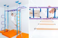 Absolutna łatwość montażu zestawu. Tata poradzi sobie z nim sam! Dostarczane drabinki są w formie złożonej, jako dwie zmontowane półdrabinki gotowe do nałożenia jedna na drugą. Forma konstruktora pozwala dołożyć dodatkowe elementy typu lina, koła gimnastyczne czy huśtawka. Osoby, które nie mogą się zdecydować gdzie taki zestaw zamontować – zawsze mogą wybrać wersję montowaną rozporowo między sufitem i podłogą, co nie wymaga wiercenia otworów w ścianie i pozwoli w przyszłości bezproblemowo przenieść drabinkę na nowe miejsce. Wersja rozporowa także dopasowuje się do wysokości mieszkania. Najmniejszy zestaw zajmuje zaledwie około 0,6 m2. Nasz zestaw Kometa-1 z powodzeniem został zamontowany w pokoju o powierzchni 10,5 m2.