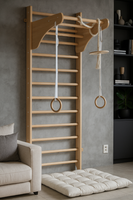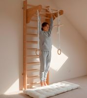 Absolutna łatwość montażu zestawu. Tata poradzi sobie z nim sam! Dostarczane drabinki są w formie złożonej, jako dwie zmontowane półdrabinki gotowe do nałożenia jedna na drugą. Forma konstruktora pozwala dołożyć dodatkowe elementy typu lina, koła gimnastyczne czy huśtawka. Osoby, które nie mogą się zdecydować gdzie taki zestaw zamontować – zawsze mogą wybrać wersję montowaną rozporowo między sufitem i podłogą, co nie wymaga wiercenia otworów w ścianie i pozwoli w przyszłości bezproblemowo przenieść drabinkę na nowe miejsce. Wersja rozporowa także dopasowuje się do wysokości mieszkania. Najmniejszy zestaw zajmuje zaledwie około 0,6 m2. Nasz zestaw Kometa-1 z powodzeniem został zamontowany w pokoju o powierzchni 10,5 m2.