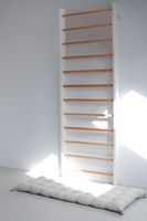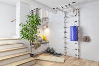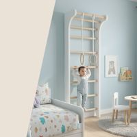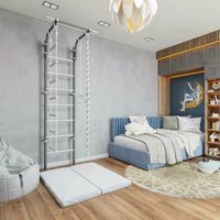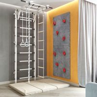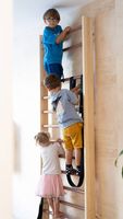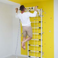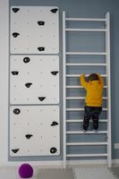 Absolutna łatwość montażu zestawu. Tata poradzi sobie z nim sam! Dostarczane drabinki są w formie złożonej, jako dwie zmontowane półdrabinki gotowe do nałożenia jedna na drugą. Forma konstruktora pozwala dołożyć dodatkowe elementy typu lina, koła gimnastyczne czy huśtawka. Osoby, które nie mogą się zdecydować gdzie taki zestaw zamontować – zawsze mogą wybrać wersję montowaną rozporowo między sufitem i podłogą, co nie wymaga wiercenia otworów w ścianie i pozwoli w przyszłości bezproblemowo przenieść drabinkę na nowe miejsce. Wersja rozporowa także dopasowuje się do wysokości mieszkania. Najmniejszy zestaw zajmuje zaledwie około 0,6 m2. Nasz zestaw Kometa-1 z powodzeniem został zamontowany w pokoju o powierzchni 10,5 m2.