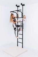 Absolutna łatwość montażu zestawu. Tata poradzi sobie z nim sam! Dostarczane drabinki są w formie złożonej, jako dwie zmontowane półdrabinki gotowe do nałożenia jedna na drugą. Forma konstruktora pozwala dołożyć dodatkowe elementy typu lina, koła gimnastyczne czy huśtawka. Osoby, które nie mogą się zdecydować gdzie taki zestaw zamontować – zawsze mogą wybrać wersję montowaną rozporowo między sufitem i podłogą, co nie wymaga wiercenia otworów w ścianie i pozwoli w przyszłości bezproblemowo przenieść drabinkę na nowe miejsce. Wersja rozporowa także dopasowuje się do wysokości mieszkania. Najmniejszy zestaw zajmuje zaledwie około 0,6 m2. Nasz zestaw Kometa-1 z powodzeniem został zamontowany w pokoju o powierzchni 10,5 m2.
