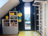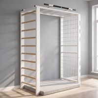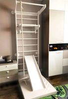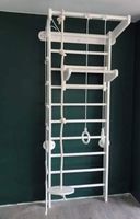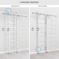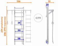 Absolutna łatwość montażu zestawu. Tata poradzi sobie z nim sam! Dostarczane drabinki są w formie złożonej, jako dwie zmontowane półdrabinki gotowe do nałożenia jedna na drugą. Forma konstruktora pozwala dołożyć dodatkowe elementy typu lina, koła gimnastyczne czy huśtawka. Osoby, które nie mogą się zdecydować gdzie taki zestaw zamontować – zawsze mogą wybrać wersję montowaną rozporowo między sufitem i podłogą, co nie wymaga wiercenia otworów w ścianie i pozwoli w przyszłości bezproblemowo przenieść drabinkę na nowe miejsce. Wersja rozporowa także dopasowuje się do wysokości mieszkania. Najmniejszy zestaw zajmuje zaledwie około 0,6 m2. Nasz zestaw Kometa-1 z powodzeniem został zamontowany w pokoju o powierzchni 10,5 m2.
