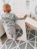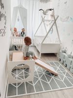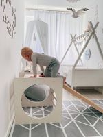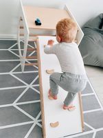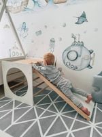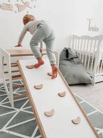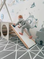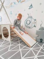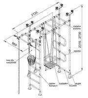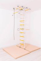 Absolutna łatwość montażu zestawu. Tata poradzi sobie z nim sam! Dostarczane drabinki są w formie złożonej, jako dwie zmontowane półdrabinki gotowe do nałożenia jedna na drugą. Forma konstruktora pozwala dołożyć dodatkowe elementy typu lina, koła gimnastyczne czy huśtawka. Osoby, które nie mogą się zdecydować gdzie taki zestaw zamontować – zawsze mogą wybrać wersję montowaną rozporowo między sufitem i podłogą, co nie wymaga wiercenia otworów w ścianie i pozwoli w przyszłości bezproblemowo przenieść drabinkę na nowe miejsce. Wersja rozporowa także dopasowuje się do wysokości mieszkania. Najmniejszy zestaw zajmuje zaledwie około 0,6 m2. Nasz zestaw Kometa-1 z powodzeniem został zamontowany w pokoju o powierzchni 10,5 m2.