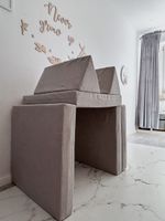 Absolutna łatwość montażu zestawu. Tata poradzi sobie z nim sam! Dostarczane drabinki są w formie złożonej, jako dwie zmontowane półdrabinki gotowe do nałożenia jedna na drugą. Forma konstruktora pozwala dołożyć dodatkowe elementy typu lina, koła gimnastyczne czy huśtawka. Osoby, które nie mogą się zdecydować gdzie taki zestaw zamontować – zawsze mogą wybrać wersję montowaną rozporowo między sufitem i podłogą, co nie wymaga wiercenia otworów w ścianie i pozwoli w przyszłości bezproblemowo przenieść drabinkę na nowe miejsce. Wersja rozporowa także dopasowuje się do wysokości mieszkania. Najmniejszy zestaw zajmuje zaledwie około 0,6 m2. Nasz zestaw Kometa-1 z powodzeniem został zamontowany w pokoju o powierzchni 10,5 m2.